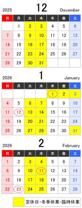 GW・夏季・冬季・臨時休業等ありますのでご注意ください